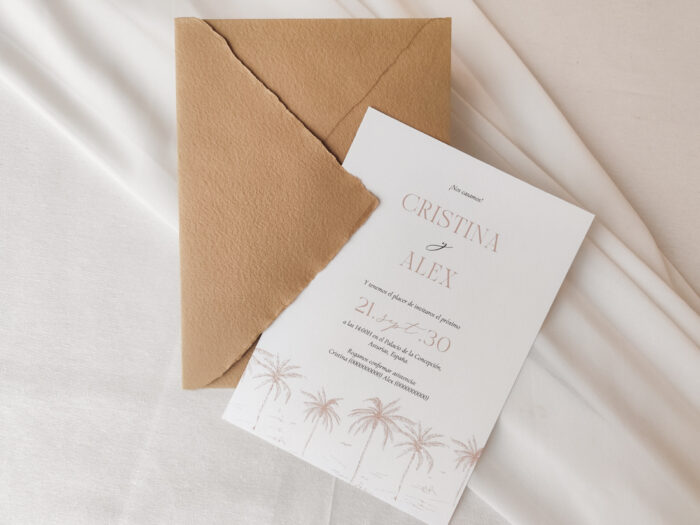 Tendencia Nº1 de este año, a nuestra colección de invitaciones no le podía faltar las «Palms». Si quieres una boda boho-chic, sin duda la invitación Palms es perfecta para ti (y aún más si la acompañas con deco del mismo estilo)